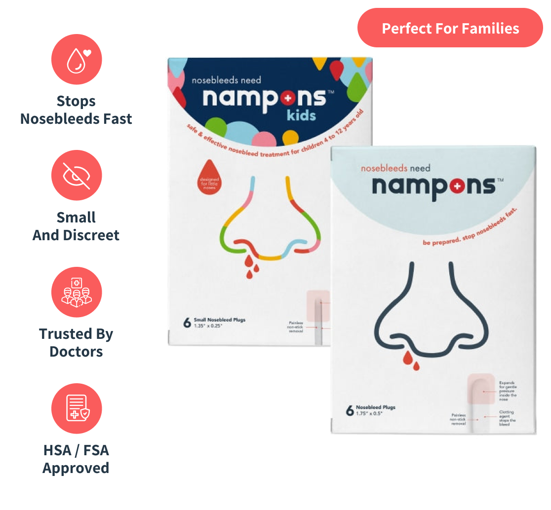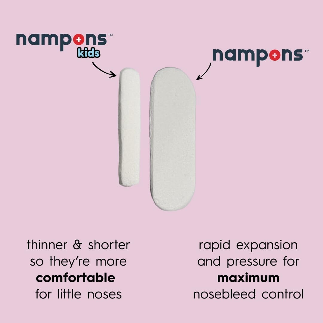 Stop nosebleeds quickly and safely. Nampons are used to treat mild to moderate nosebleeds in children, allergy sufferers, adults, those with bleeding disorders such as HHT, athletes, and seniors. Nampons have been used by hospitals, doctors, and first-responders for over a decade and are now available over the counter (OTC).